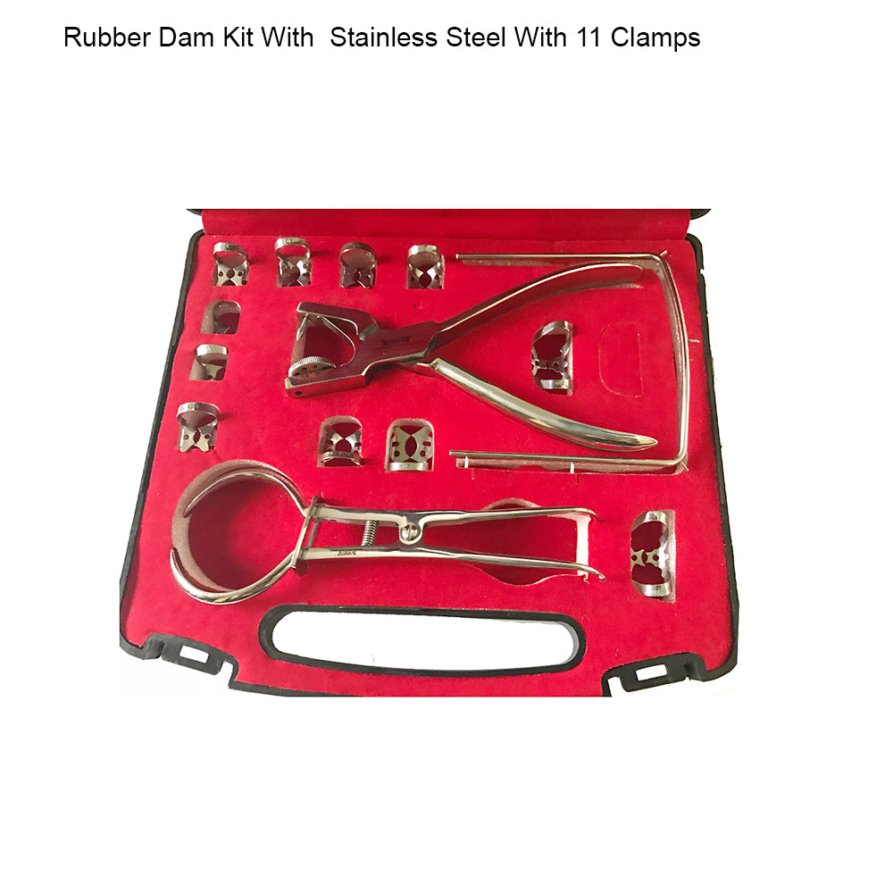 -Kit contains #1.Punch Plier Ainsworth # 2. Clamp Forceps Stokes # 3. Rubber Dam Frame Young Medium #4 Rubber Dam Clamp No.27 #5. Rubber Dam Clamp No.4 #6. Rubber Dam Clamp No.12A #7. Rubber Dam Clamp No.212 #8. Rubber Dam Clamp No.3 # 9. Rubber Dam Clamp No. 8A #10. Rubber Dam Clamp No.13A #11. Rubber Dam Clamp No.00