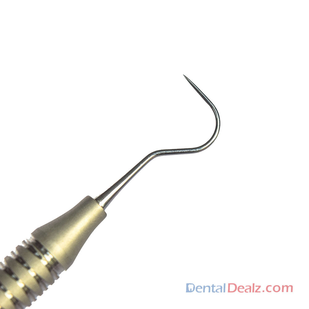sharp pointed to explore teeth and restoration surfaces to detect caries and other defects.