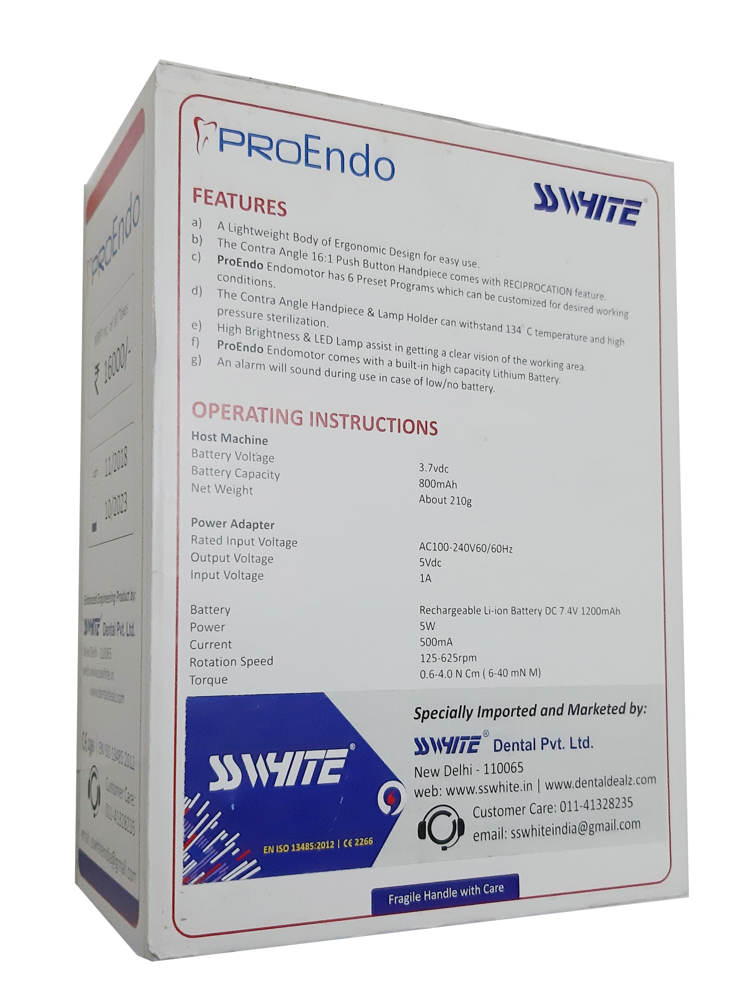 Features. ✔️ A Light weight Body of Ergonomic Design for easy use. ✔️ The Contra Angle 16:1 Push Button Handpiece comes with RECIPROCATION feature conditions. ✔️ProEndo Endo Motor has 6 preset programs which can be customized for desired working conditions. ✔️ The Contra Angle handpiece & Lamp Holder can withstand 134 C Temperature and high pressure sterilization. ✔️High Brightness & LED Lamp assist in getting a clear vision of the working area. ✔️ProEndo Endomotor comes with a built-in high capacity Lithium Battery. ✔️ An alarm will sound during use in case of low /no Battery.